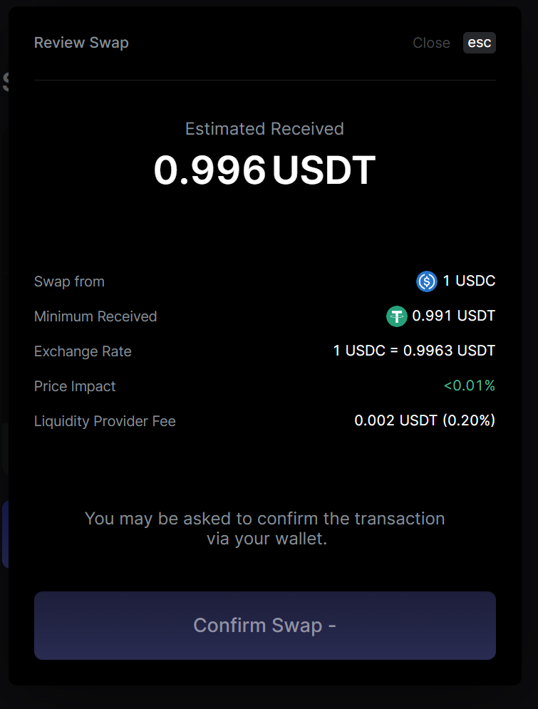 - Select Confirm Swap. Depending on what wallet you're using, you'll likely be prompted to confirm the transaction via your wallet's interface.